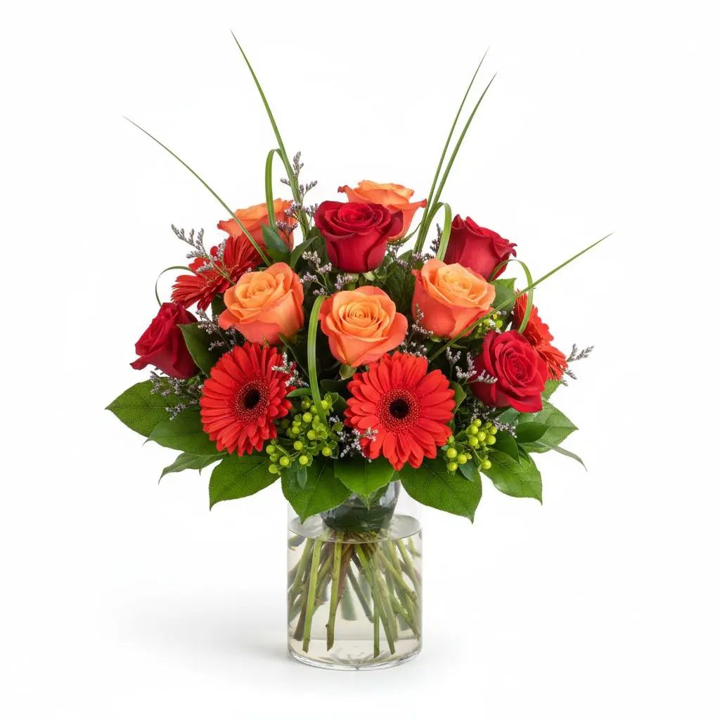 Ignite warmth and joy with the Autumn Ember Floral arrangement, a breathtaking display of red and orange roses and gerberas. This vibrant bouquet, accented with lush greens, captures the essence of autumn's beauty. Perfect for brightening any space or celebrating a special moment.