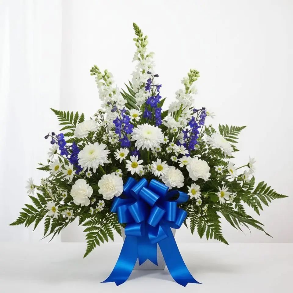 Step into a world of serene beauty with the Azure Dream, a breathtaking arrangement of pristine white blooms and vibrant blue delphiniums. This exquisite bouquet evokes feelings of calm and pure joy, perfect for brightening any space or occasion. Let its gentle charm transform your moments into cherished memories.