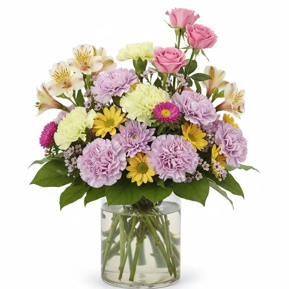 Discover the delightful 'Classic Charm,' a beautiful blend of roses, alstroemeria, carnations, and more. This vibrant bouquet is designed to bring joy and a touch of timeless elegance to any space. Brighten your day or surprise a loved one with this exquisite floral arrangement.