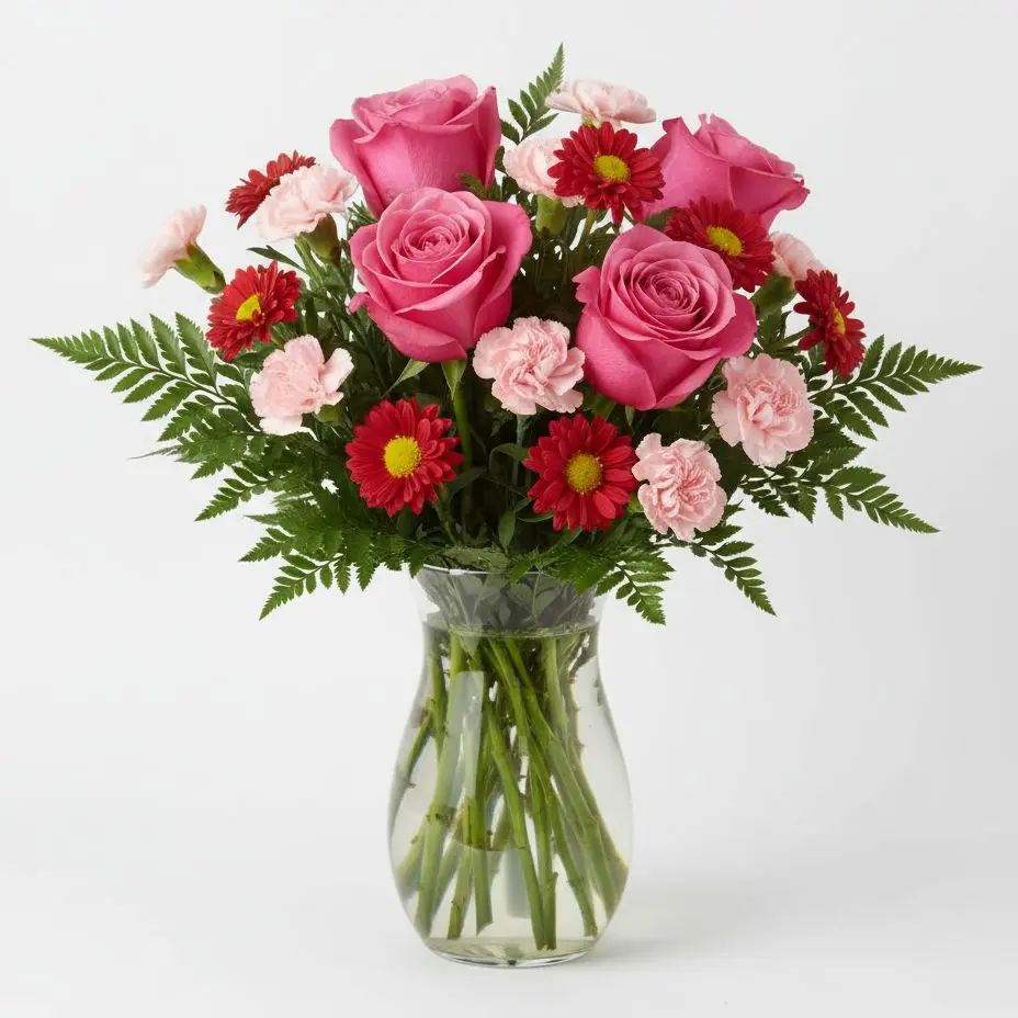 Celebrate heartfelt connections with Love's Embrace, a vibrant arrangement featuring radiant hot pink roses, charming pink mini carnations, and spirited red asters. This stunning bouquet, nestled in a clear vase, beautifully conveys affection and warmth. It's the perfect way to brighten someone's day and express your deepest emotions.