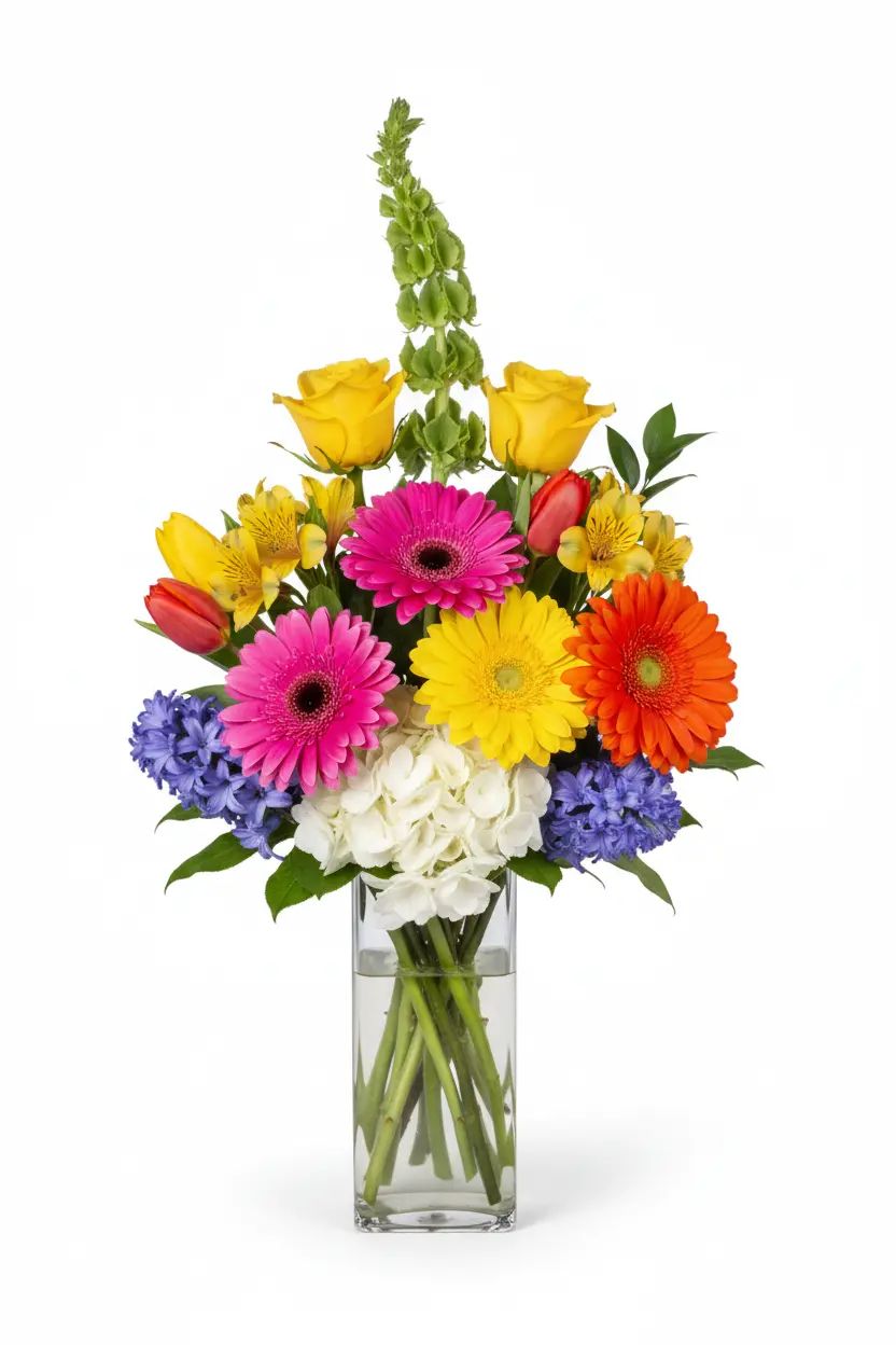 Brighten any day with the 'Sunshine & Smiles,' a vibrant mix of cheerful yellow roses, alstroemeria, and playful gerbera daisies. Lush hydrangeas and fragrant hyacinths add a touch of elegance, creating a truly uplifting floral experience. It's the perfect way to spread joy and warmth to someone special.